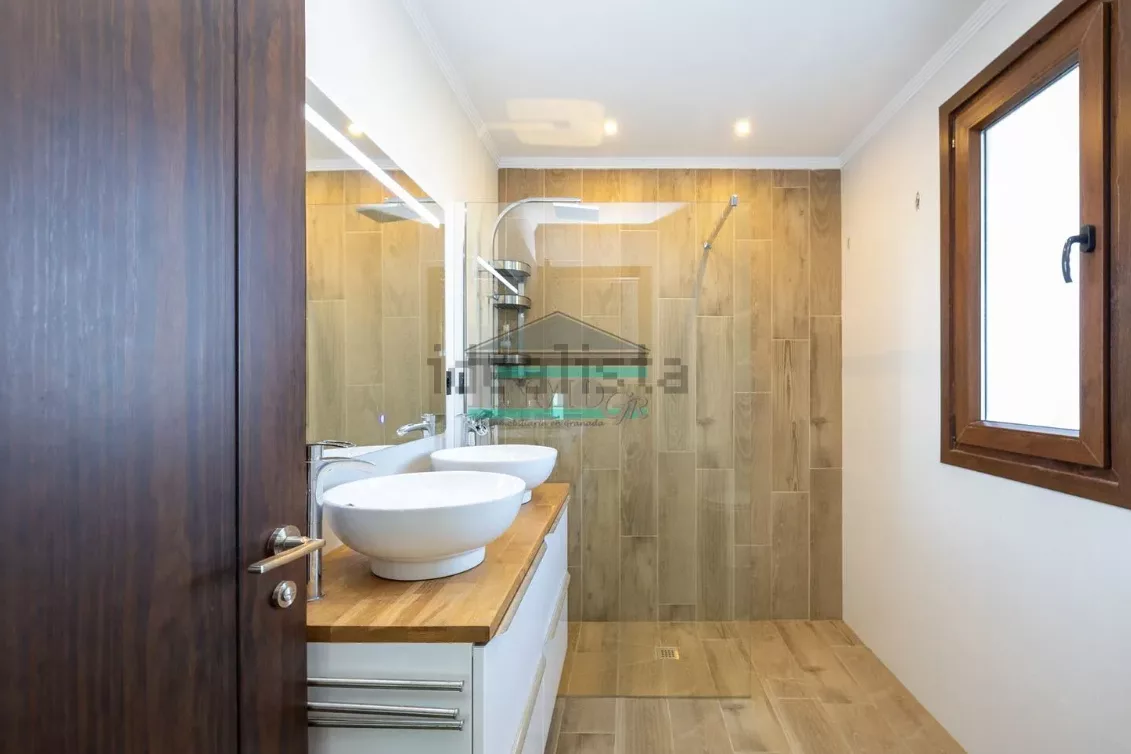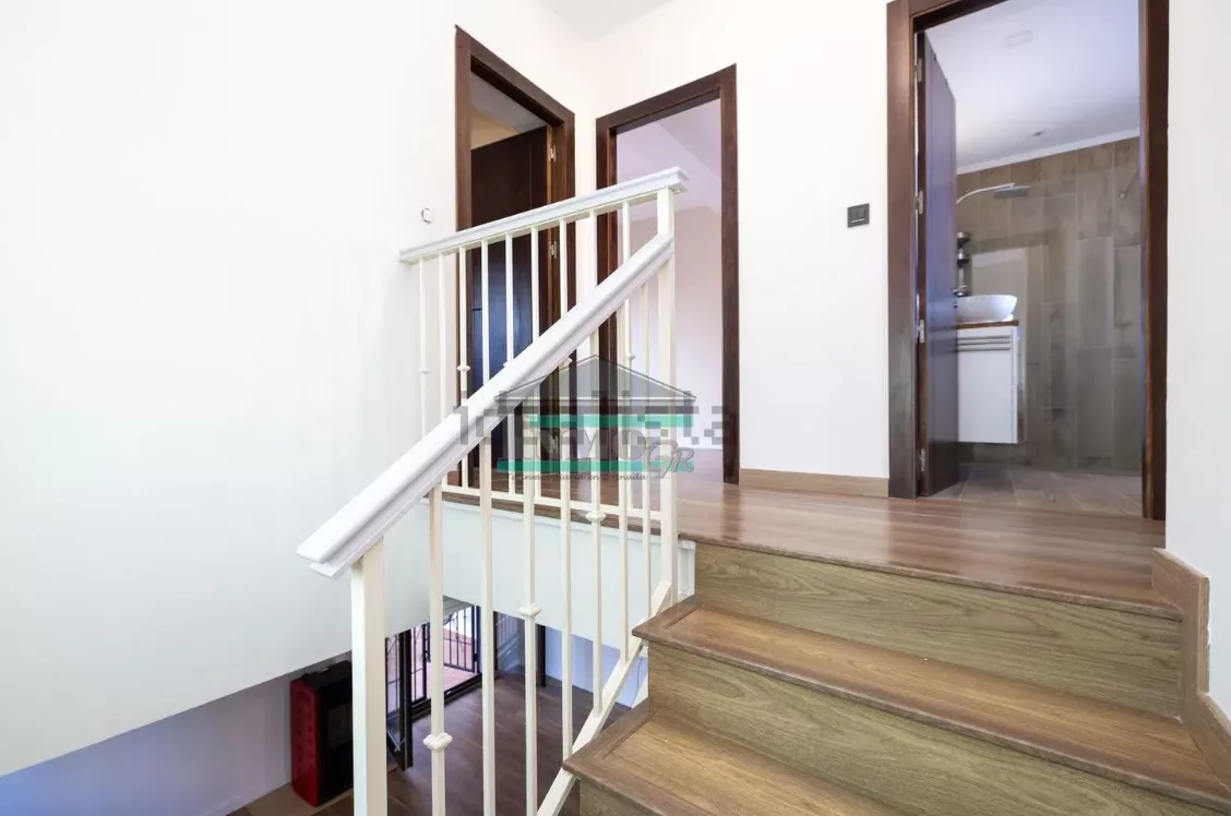 La parte superior de la vivienda tiene tres dormitorios con grandes armarios empotrados revestidos, contando la habitación principal con una espectacular terraza con vistas a la Sierra, amplísimo baño con mobiliario y lavabo de doble seno y ducha italiana.